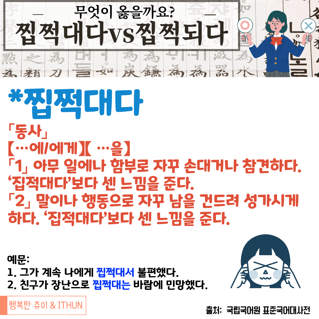 오늘은 '찝쩍대다'를 정리해 보았다.