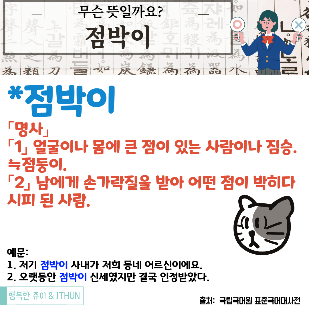 오늘은 '점박이'와 '-박이'에 대해 정리해 보았다. 사실 점이 있는 사람이나 짐승에 대해 '점박이'라고 부른다라고 생각했는데 '점박이'는 큰 점이 있는 사람이나 짐승을 일컫는 말이었다니 놀랬다. 그리고 이것 외에도 다른 뜻을 가지고 있었다는 사실과 그 뜻이 '남에게 손가락질을 받아 어떤 점이 박히사디시피 된 사람.'을 의미한다는 것이 신기했다.