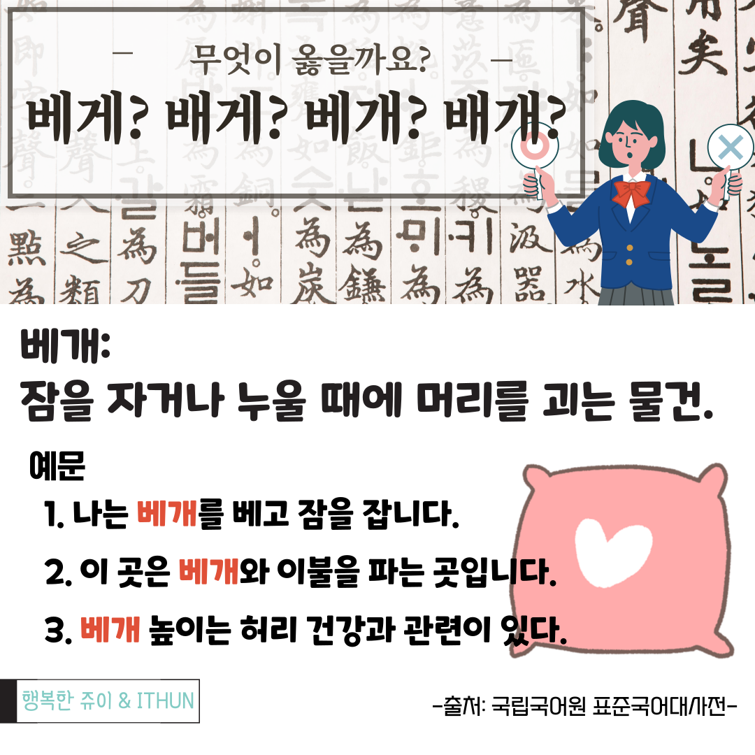 '베' 라는 글자 뒤에 '개' 가 붙은 것으로 그냥 그대로 '베개' 라고 쓰면 된다고 한다.