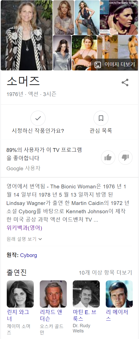 그 어디에도 정확하게 '소머즈' 가 무슨 단어의 뜻이라고 정의해 둔 곳이 없었다. ㅠㅠ 다만 그 기원이 'The Bionic Woman' 의 여자 주인공의 이름이었다는 사실에 대해 새롭게 알 수 있었다.