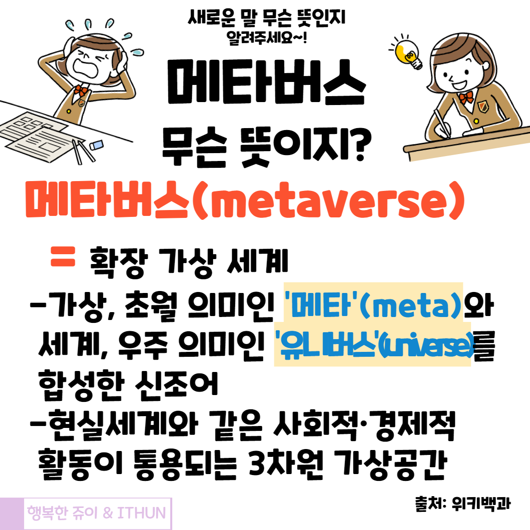 요즘 메타버스 관련 기사, 주식 등 정말 '핫하다' 처음엔 메타버스라고 하길래? 무슨 버스이름인가? 싶었다. ( 설마, 나만 이렇게 생각한 건 아니겠지... :( ) 어쨌든 메타버스가 무엇인지 살펴보자!