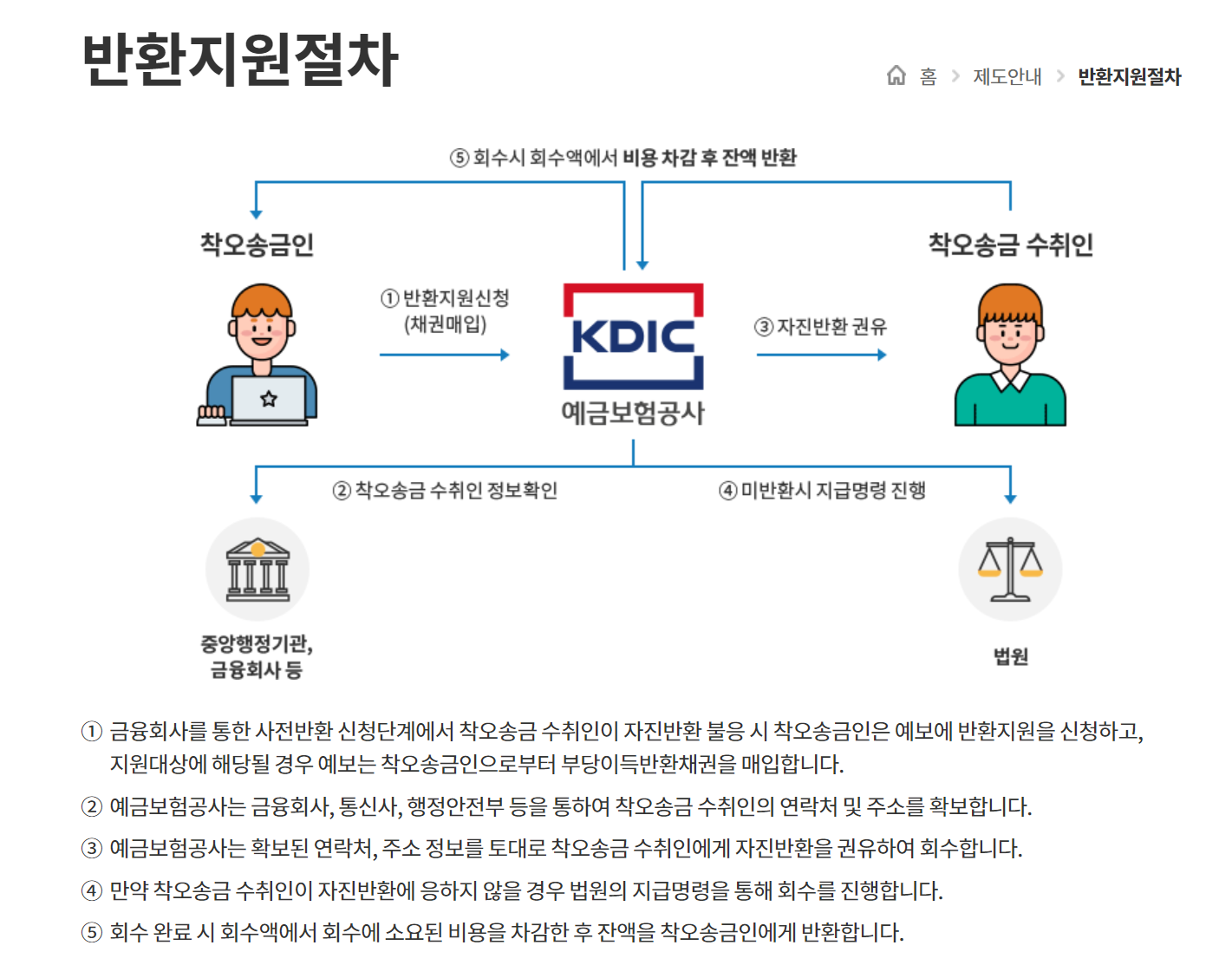[착오송금 반환지원 제도] 는 송금인이 실수로 잘못 송금한 돈을 예금보험공사가 대신 찾아주는 제도! 착오송금이 발생했을 때 먼저 금융회사를 통해 자진반환을 요청하여야 하며, 그럼에도 반환되지 않는 경우 예금 보험공사에 신청할 수 있다. 신청 대상은 2021년 7월 6일 이후에 발생한 건에 해당되며 50,000원 이상 10,000,000원 이하의 착오송금 건이다.