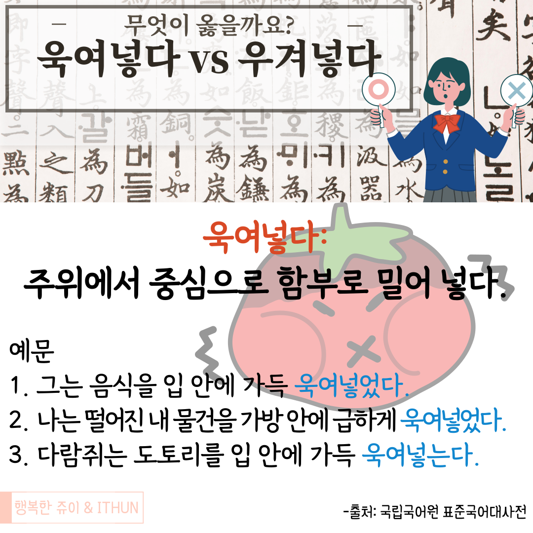 그러다가 '욱여/우겨 넣다' 뭐가 맞는 표현인지 궁금해졌다. 함께 알아보자!