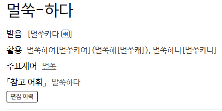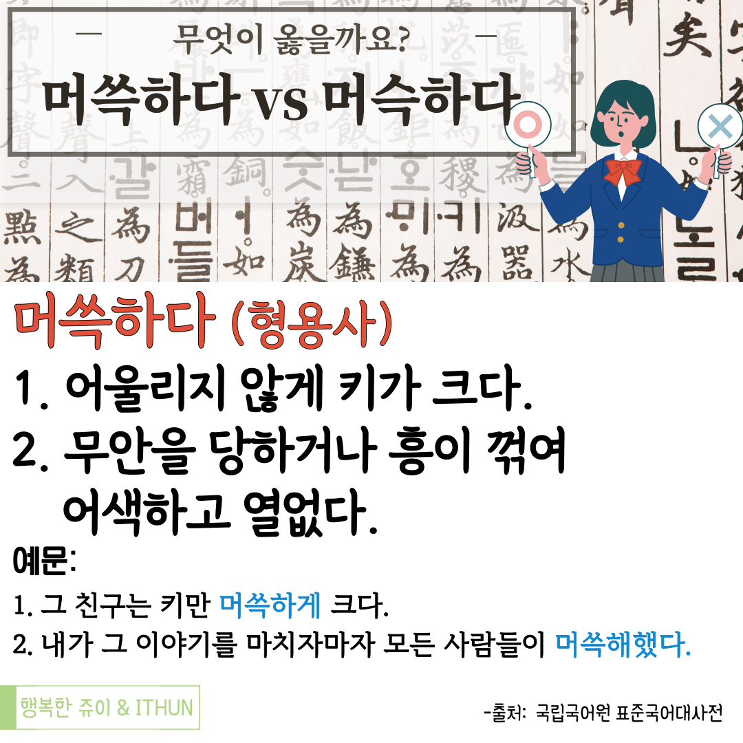 오늘은 '머쓱하다' 와 '멀쑥하다' 이렇게 두 가지 단어를 배워보았다. '머슥하다' 로 사용하지 않고 '머쓱하다' 로 사용하기 그리고 '머쓱하다' 와 '멀쑥하다' 는 뜻 구분하여 사용하기! 기억해야겠다.