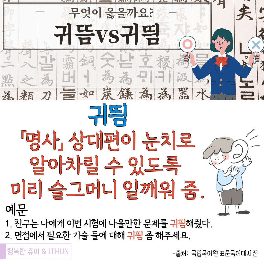 올바른 표현은 '귀띔' 이라는 사실 잊지 말고 기억하자!