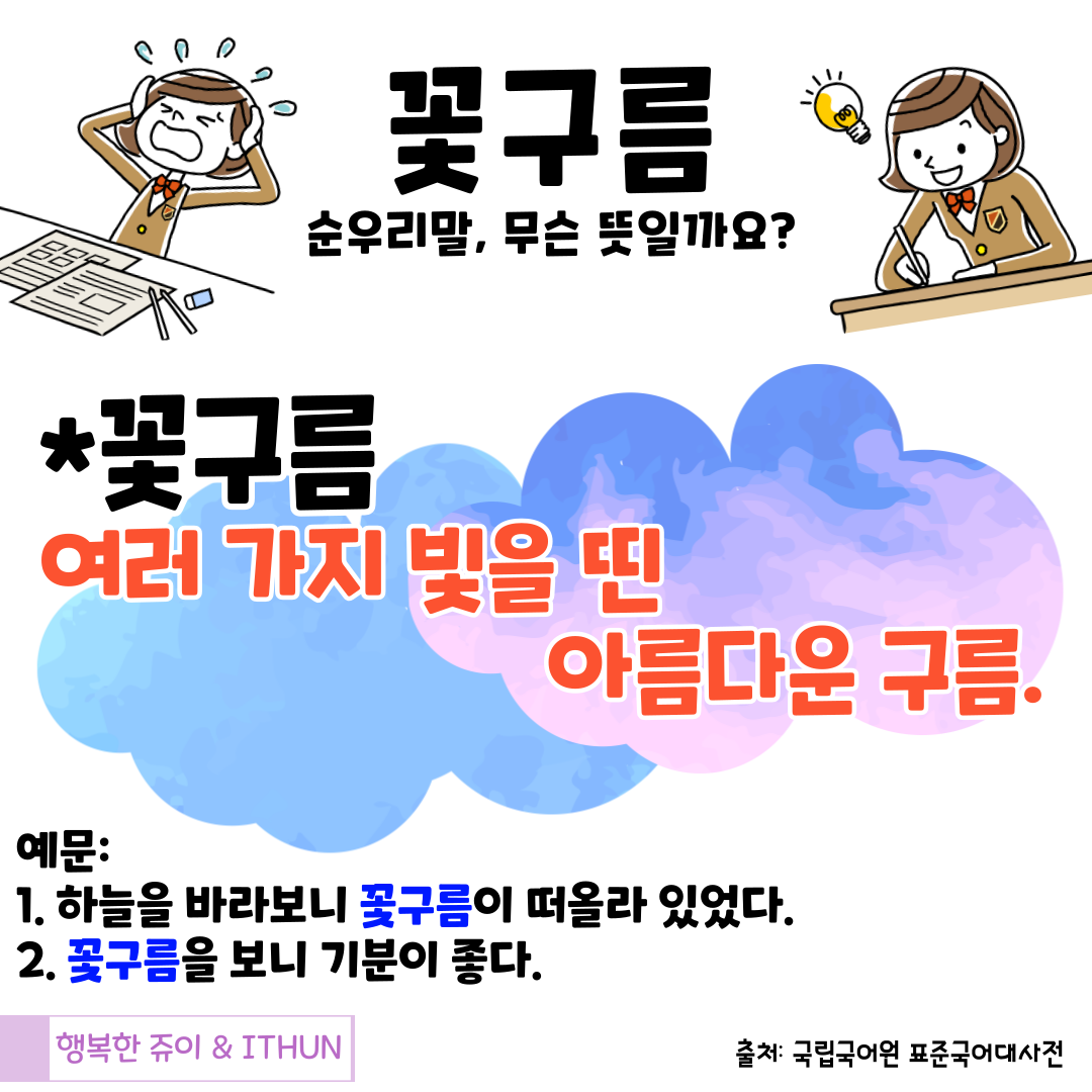'꽃구름' 은 여러 가지 빛을 띤 아름다운 구름이라는 뜻을 가진 순우리말이다.