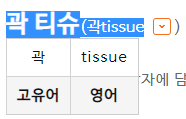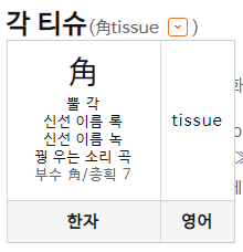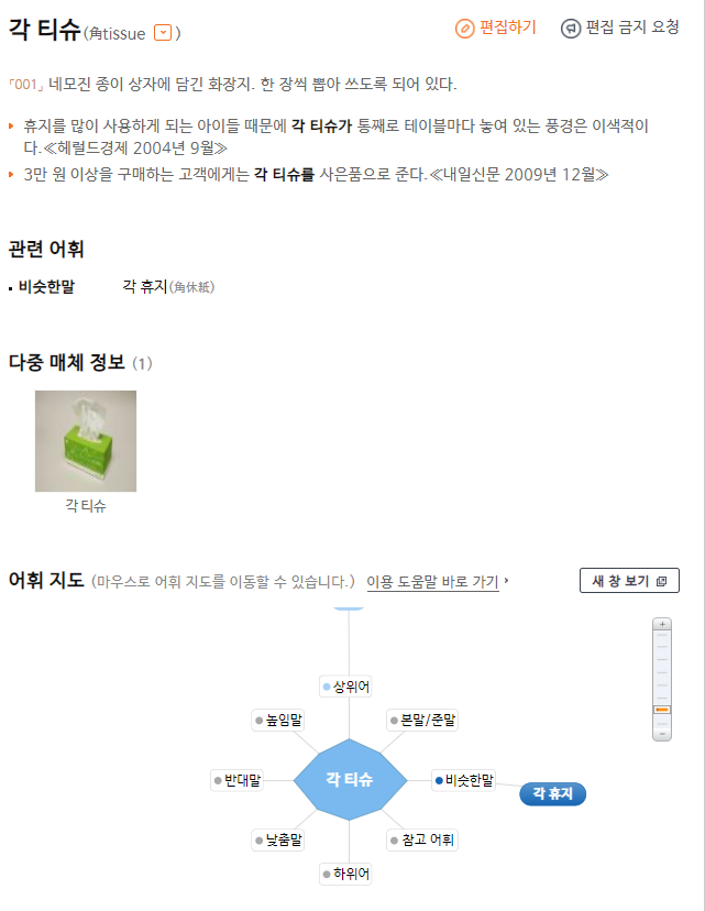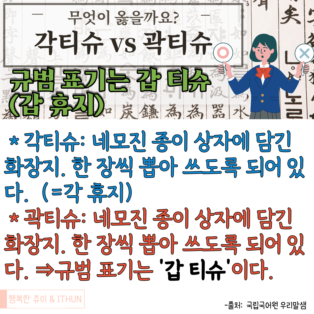 각 티슈 또한 맞지 않다. 일상에서 많이 쓰이고 있긴 하지만, 각은 면과 면이 만나 이뤄지는 모서리를 뜻하는 말이므로 각 티슈도 바르지 않다.