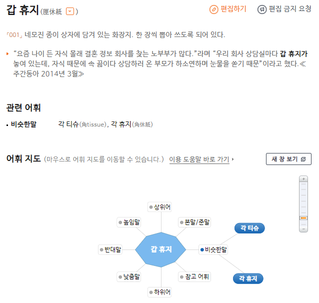 「001」네모진 종이 상자에 담긴 화장지. 한 장씩 뽑아 쓰도록 되어 있다. ⇒규범 표기는 ‘갑 티슈’이다.
