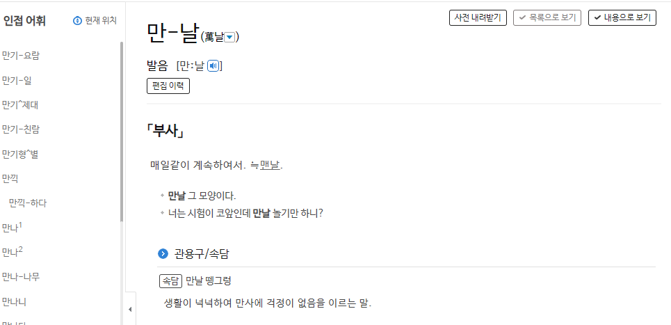 국립국어원 표준국어대사전에서 '만날' 을 찾아보았다.