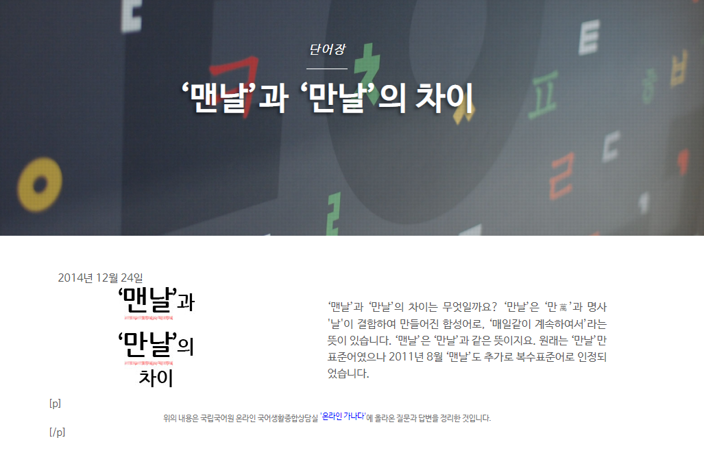 남편과의 대화를 통해 '맨날' 과 '만날' 이 표준어라는 사실을 알게 되었지만 정말 그러한지 정리해보려고 한다.