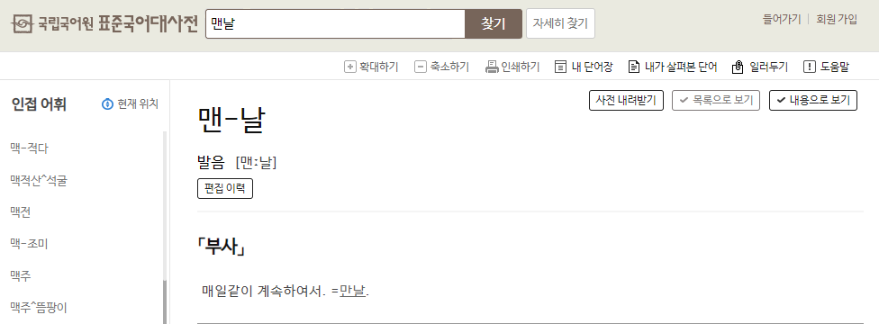 국립국어원 표준국어대사전에서 '맨날' 을 검색해보았다.