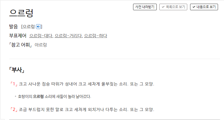 이 두 단어가 딱 떠올랐다. 그러다가 호랑이의 울음 소리(의성어) '어흥' 이구만... 떡 하나만 주면 안 잡아먹지? '어흥' 이라는 구절이 생각이 났다. 그럼 사자 울음 소리 (의성어)는 '으르렁' 이구나! 는 생각을 하였다. 그런데 확실하지는 않으니, 정확히 알아보고자 국립국어원 표준국어대사전 사이트에서 '어흥' 과 '으르렁' 을 검색해보기로 하였다.