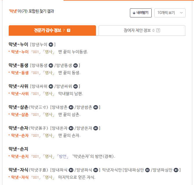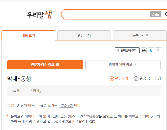 국립국어원 표준국어대사전에 먼저 '막내동생' 을 검색해보았다.