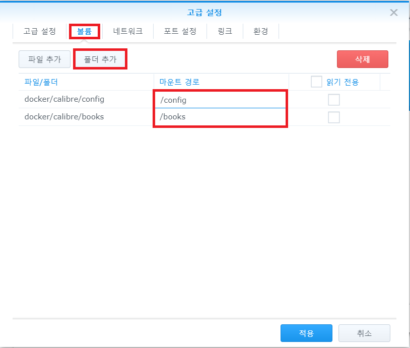 2-6. 폴더 추가하기 전에 사전에 미리 시놀로지 volume1에 calibre docker를 설치할 config와 books 폴더를 생성해놓는다.