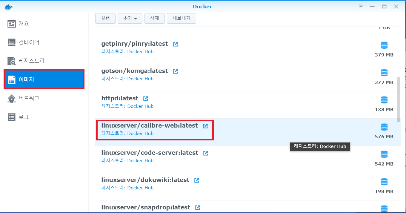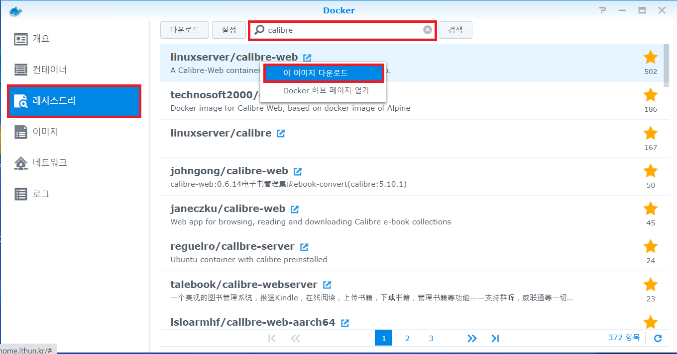 1-4. 가장 첫번째로 나오는 linuxserver/calibre-web를 우클릭하여 이 이미지를 다운로드한다. 물론 더블클릭을 해도 된다.