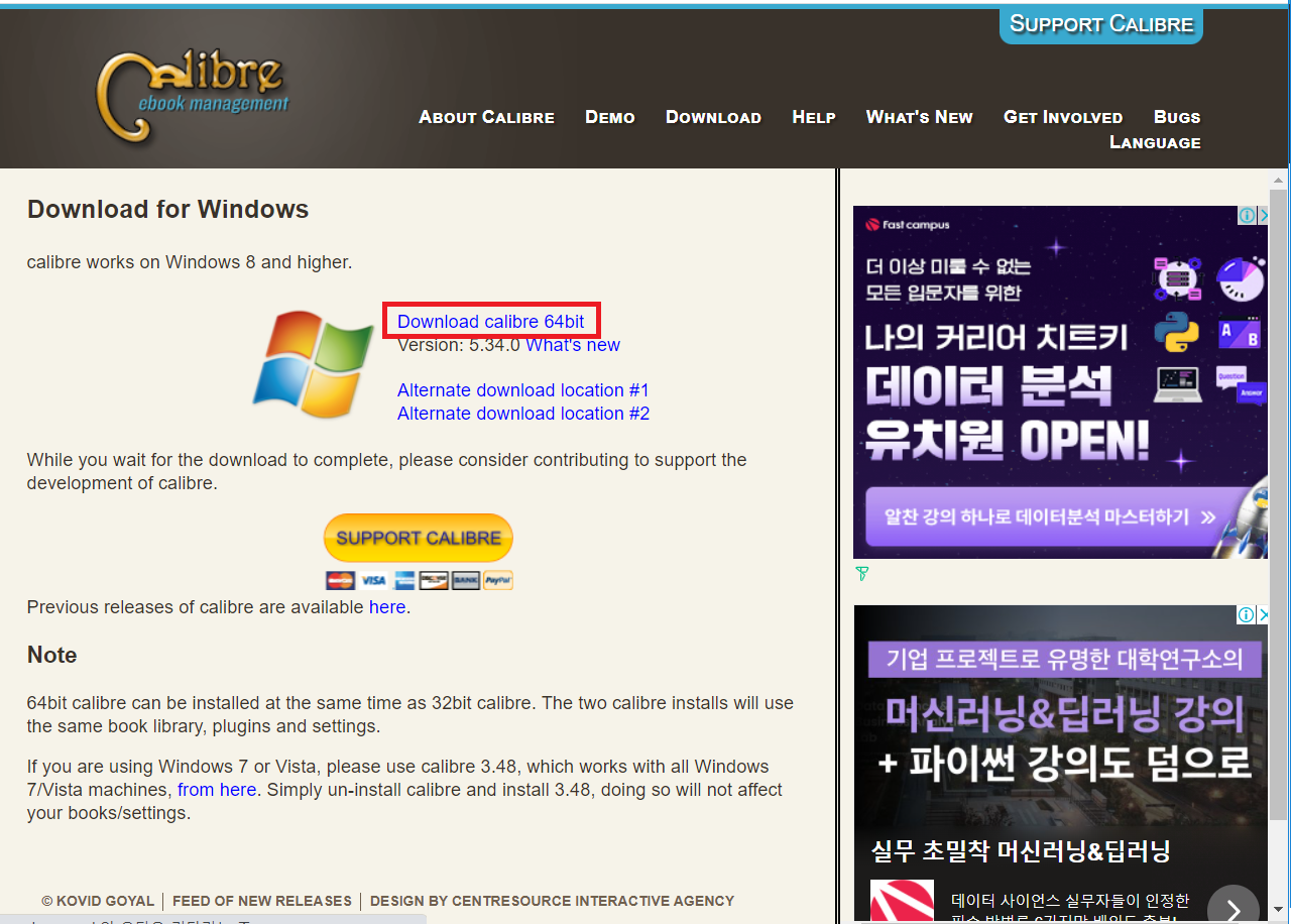 1-4. Dowload calibre 64bit를 클릭하여 프로그램을 다운한다.