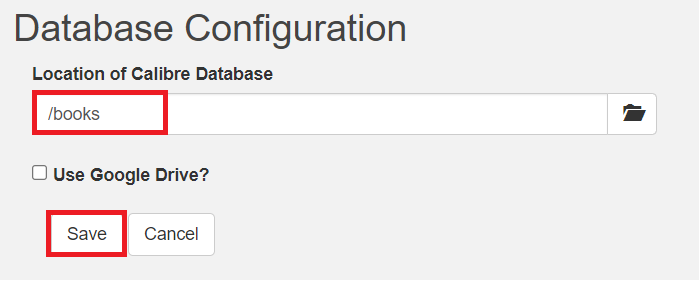 7-1. 이제 마지막이다. Location of Calibre Database에는 꼭 /books를 입력해야 한다. 다른 경로를 입력하게 되면 사이트에 접속이 불가하다. 꼭 /books를 입력하고 save 버튼을 누른다.