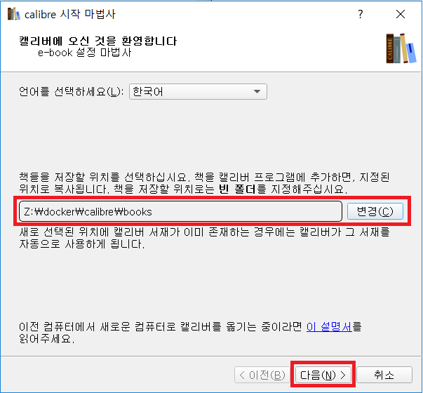 앞으로는 윈도우용 캘리버를 이용해 책들을 관리할 것이다. 여기에서 중요한 것은 아래의 사진에 보면 calibre-web docker에서 책들을 저장할 위치 docker/calibre/config 와 윈도우용 calibre 프로그램에서 책들을 저장한 위치와 같아야 한다. 자세히 보면 위치가 다른 것을 알 수 있다. 윈도우용 calibre 프로그램은 저장할 위치 docker 앞에 Z:\가 있는 것이 보이는데 이는 Raidrive 프로그램 설치해서 나스를 wedav로 연결하여 z 드라이브로 운영중에 있다. 나스를 사용한다면 꼭 Raidrive 이용하는 것을 권장한다.