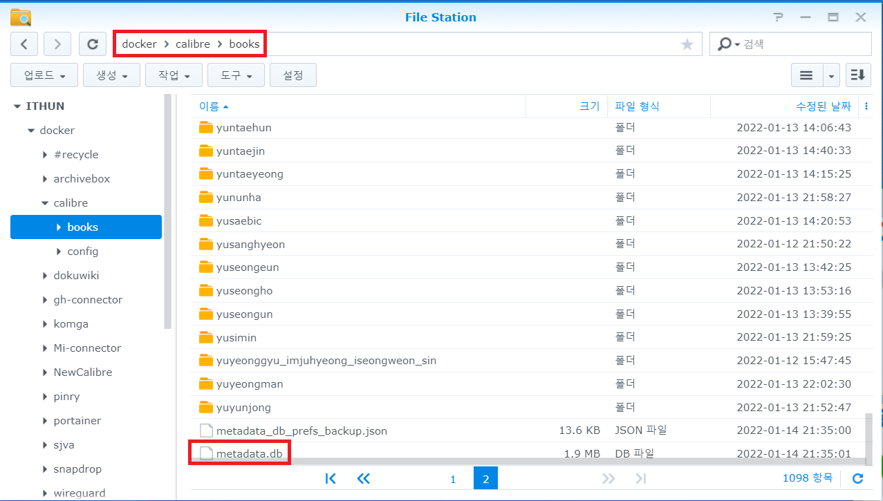 4-1. calibre 프로그램을 꼭 종료를 하고 시놀로지 홈페이지 접속하여 calibre-web docker에서 책들을 저장할 위치에 접속해보면 metadata.db가 생성되어 있는 것이 보일 것이다. databasefile이 꼭 있어야 calibre-web docker가 제대로 작동할 수 있다.