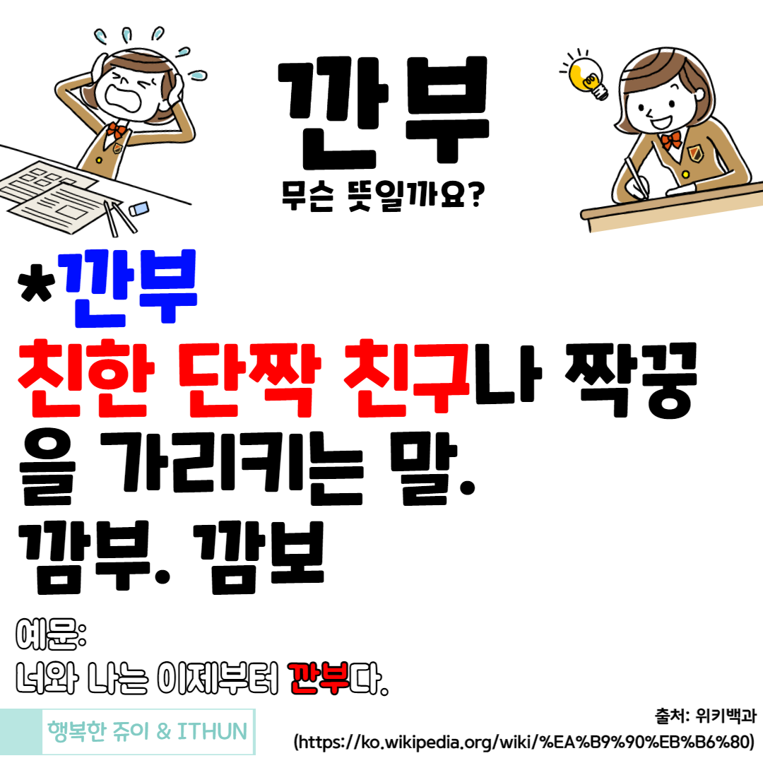 '오징어 게임' 한국드라마가 정말 핫하다. 그러면서 함께 알려지게 된 '깐부' 라는 단어! '깐부' 는 '단짝 친구'를 의미한다는 것을 알고 있었다. 근데... 깐부가 옛날에 사용했던 '단짝 친구' 를 이야기하는 우리말이라고 생각했는데... 막상 찾아보니, 정확한 어원을 찾을 수가 없었고, 국립국어원 표준국어대사전에서 검색되지 않는 단어였다. '깐부' 는 어디에서 온 것일까? 함께 알아보자.