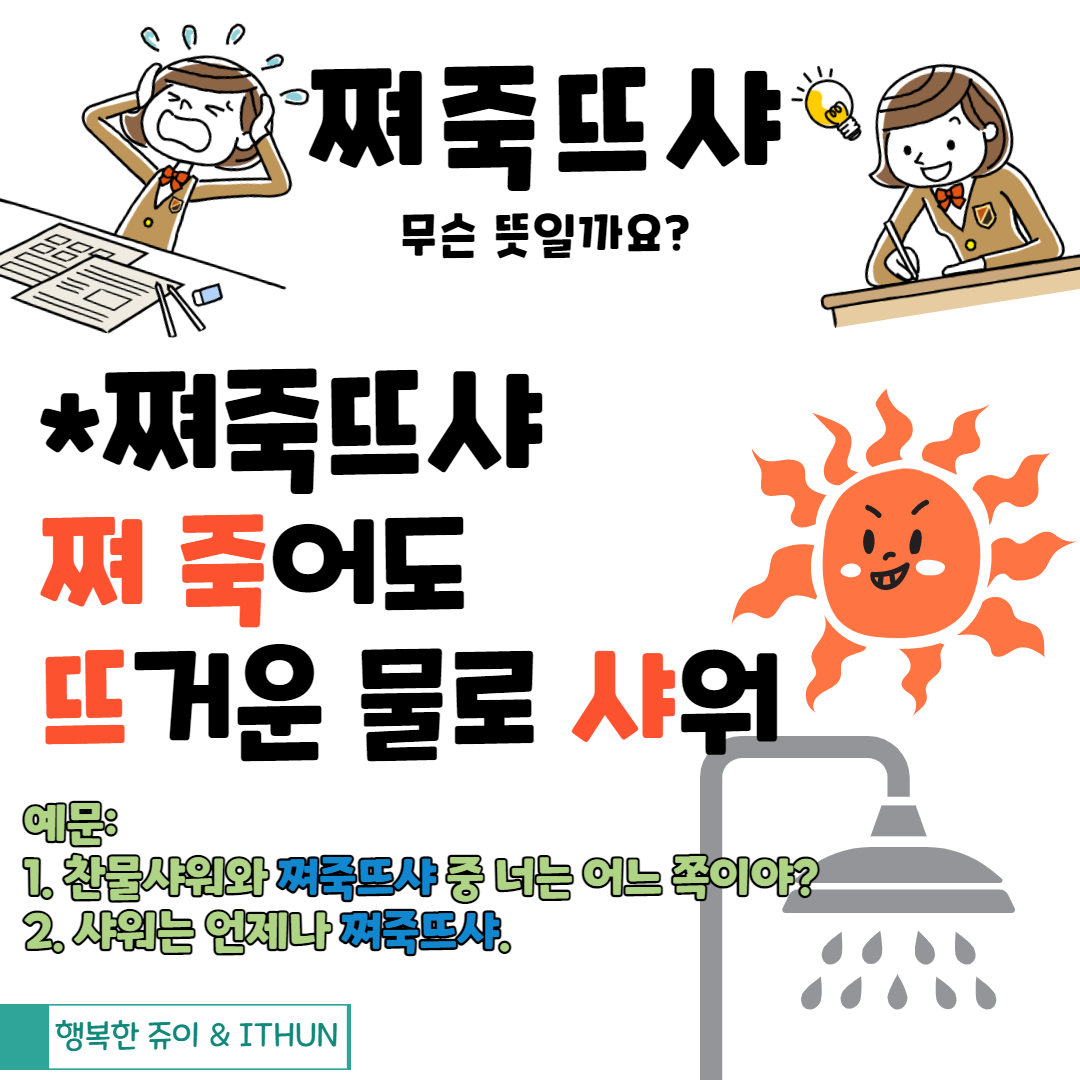 어쨌든 쪄죽뜨샤와 찬물샤워는 서로 반대되는 단어로 각자 다른 샤워타입을 대표하기도 하였다.