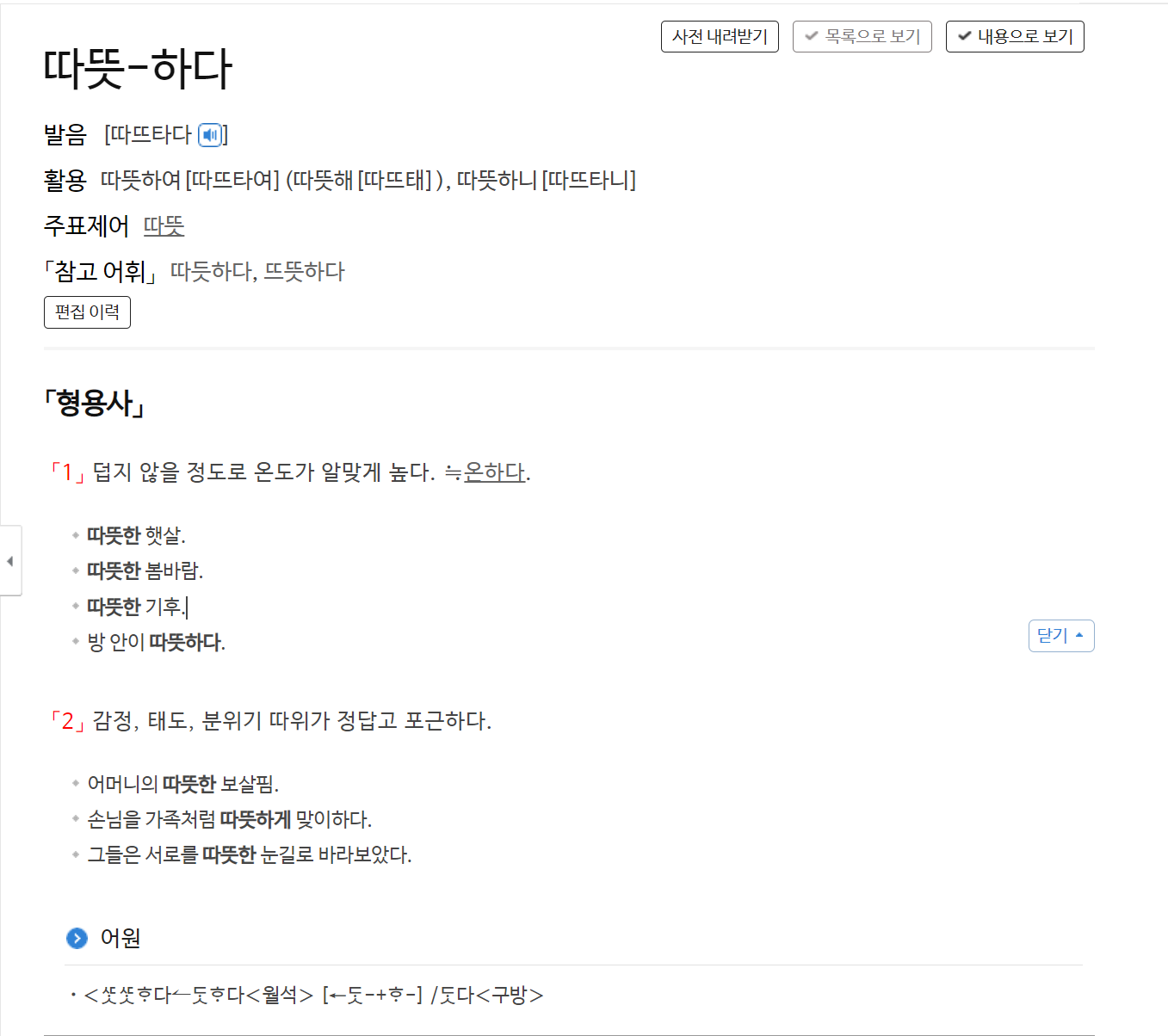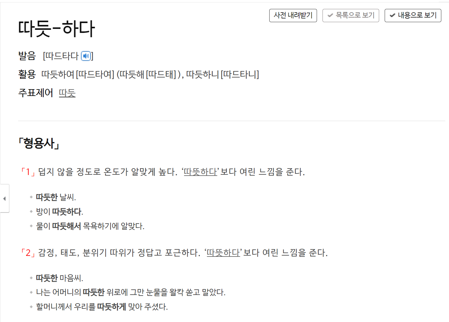 먼저 국립국어원 표준국어대사전에서 '따뜻하다' 를 검색해보았다.