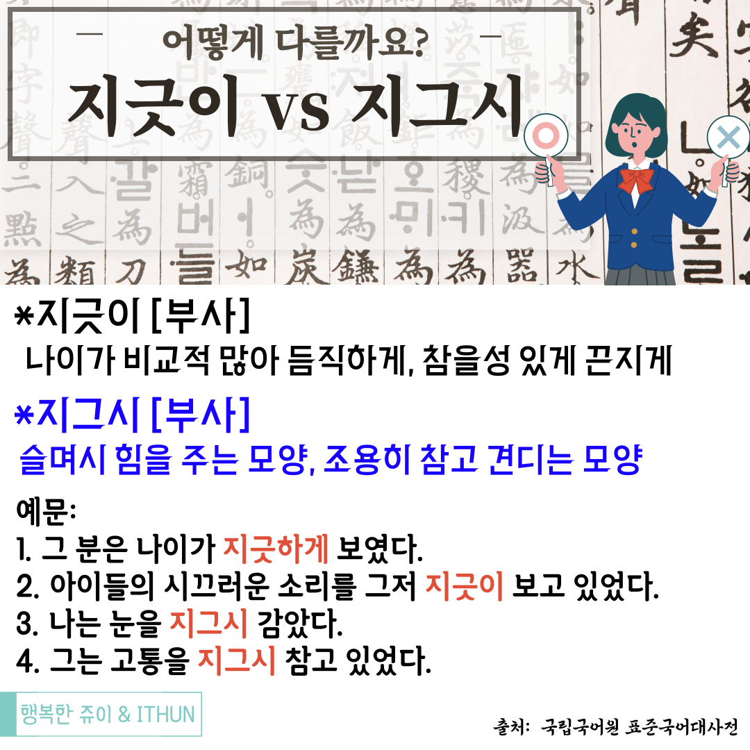 '지긋이' 와 '지그시' 를 정리해보았다.