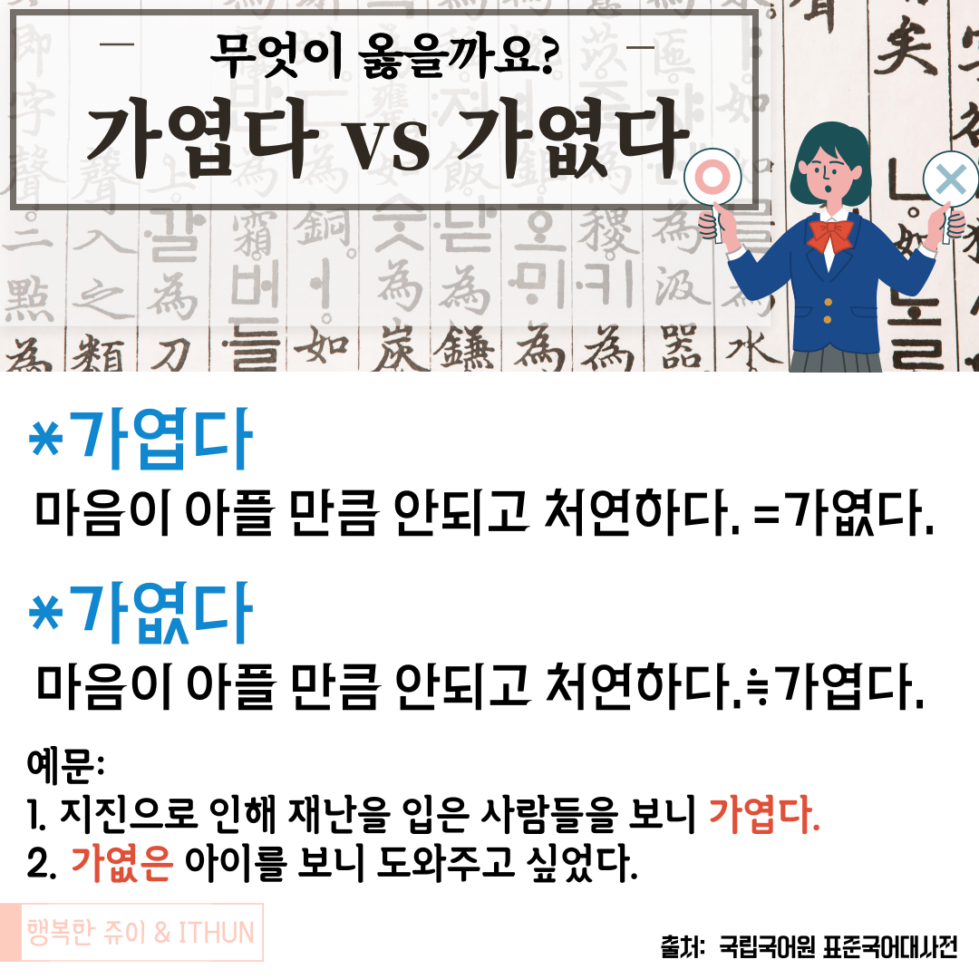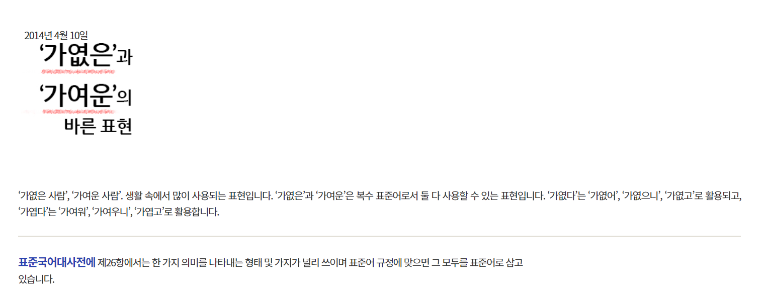 ‘가엾은 사람’, ‘가여운 사람’. 생활 속에서 많이 사용되는 표현입니다. ‘가엾은’과 ‘가여운’은 복수 표준어로서 둘 다 사용할 수 있는 표현입니다. ‘가엾다’는 ‘가엾어’,