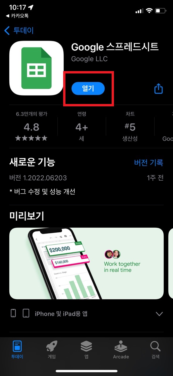 카카오톡에서 구글스프레드시트 문서를 열면 이렇게 스프레드시트 앱으로 편집하라는 문구가 뜬다. 그래서 앱 다운로드를 하면....