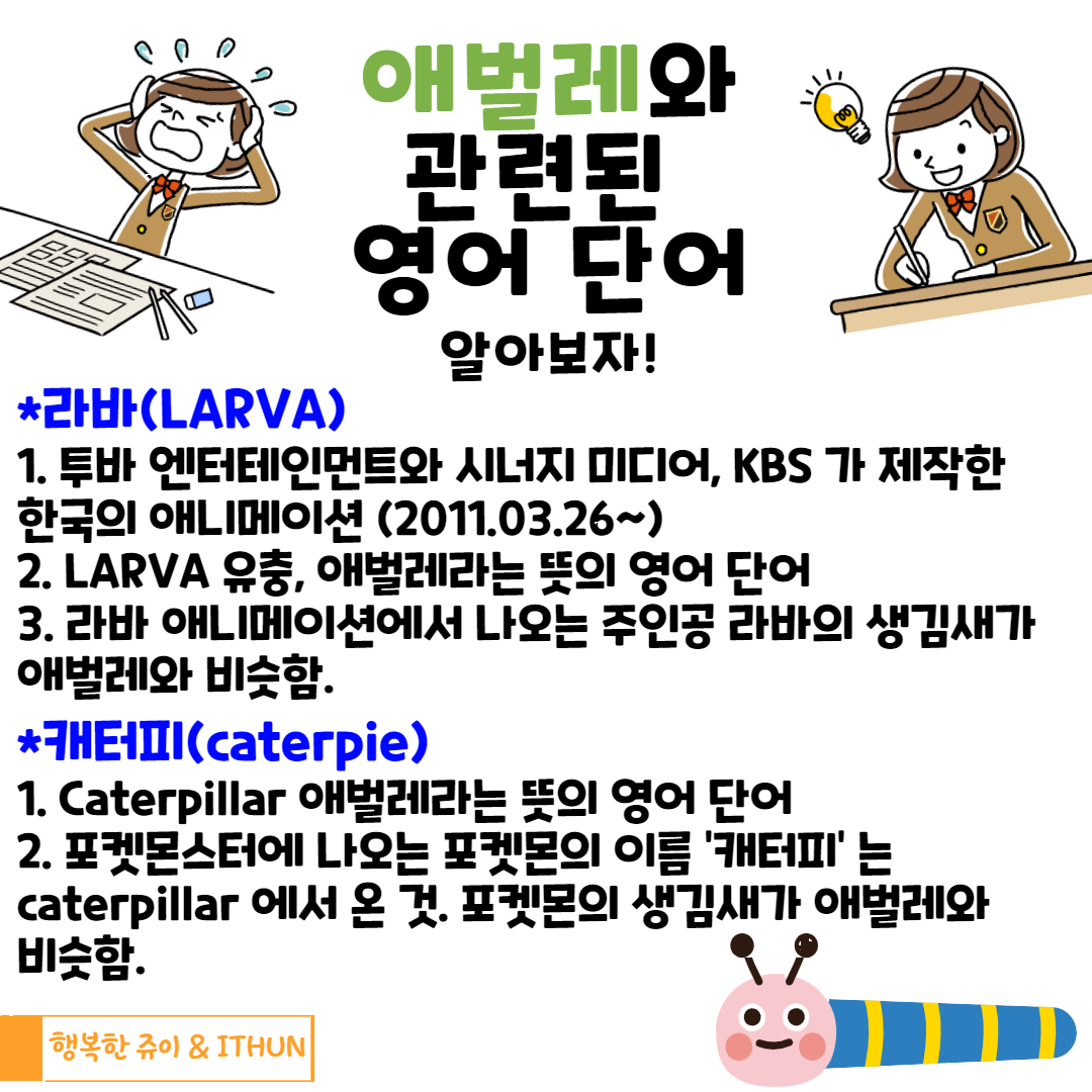 무심코 애벌레와 관련된 영어 단어를 알아보다가 LARVA 가 애벌레라는 뜻의 영어 단어임을 알고 깜짝 놀랬다. 학창시절 caterpillar 를 애벌레라며 영어 단어 외웠던 건 생각이 나는데... Larva는 정말 새로웠다. 그래서 나와 같은 사람이 있을까? 싶어 ㅎㅎ 그리고 잘 기억해보고자 적어보려고 한다.