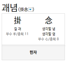 사실 요즘은 괘념이란 말을 많이 쓰지 않는 것 같다. 그래서 더욱더 그 단어의 모양이 생소하고 소리가 비슷한 '궤념' 과 쉽게 헷갈리는 것 같다. 마음에 두고 걱정하거나 잊지 않음을 의미하는 '괘념' 비슷한 말로 계념, 괘심, 괘의가 있는데 사실 이 비슷한 말은 나도 처음 알게 된 단어라 정말 낯설었다.