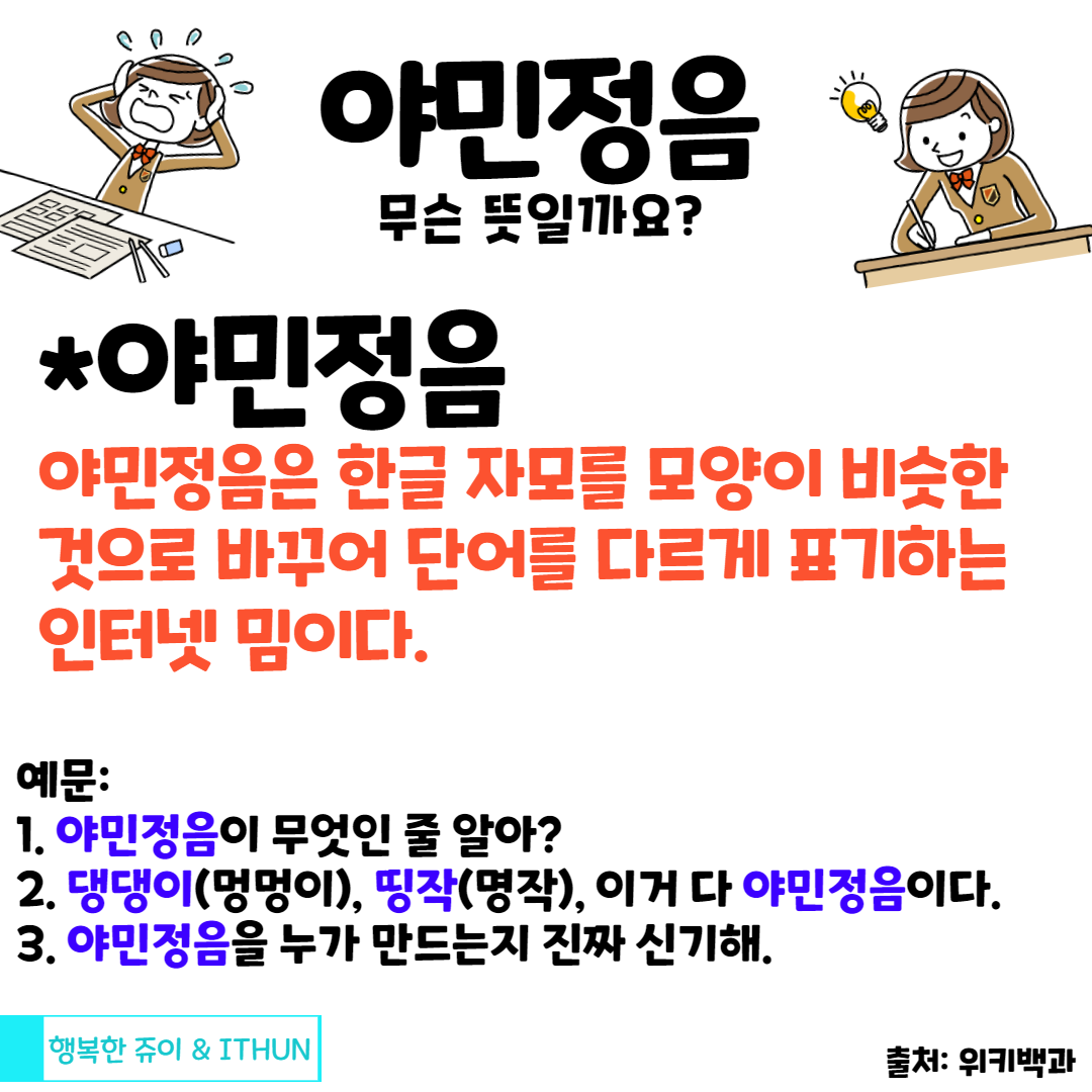 야민정음? 이 말을 처음 들었을 때 '훈민정음' 과 연관은 있을 것 같은데... 정확히 무슨 뜻인지는 알 수 없었다. 우리나라 말, 한글을 재미있게 변형시킨 단어를 의미하는 것일까? ㅋ 궁금한 건 못 참지! 그래서 알아보았다.