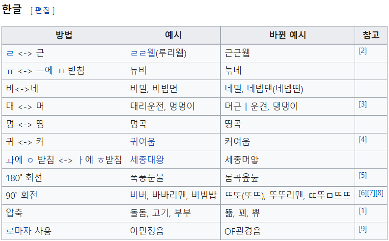 야민정음은한글자모를 모양이 비슷한 것으로 바꾸어 단어를 다르게 표기하는인터넷 밈이다. 대표적인 예로는 '댕댕이(멍멍이)', '띵작(명작)' '괄도 네넴띤(팔도 비빔면)' 등이있다.디시인사이드국내야구 갤러리에서 발전하여 지금과 같은 형태가 되었다. 이름은 디시인사이드 국내야구 갤러리의 별명인 '야갤'과훈민정음에서 따와서 야민정음이 되었다. 영미권의리트과 비슷하다고 볼수 있다.