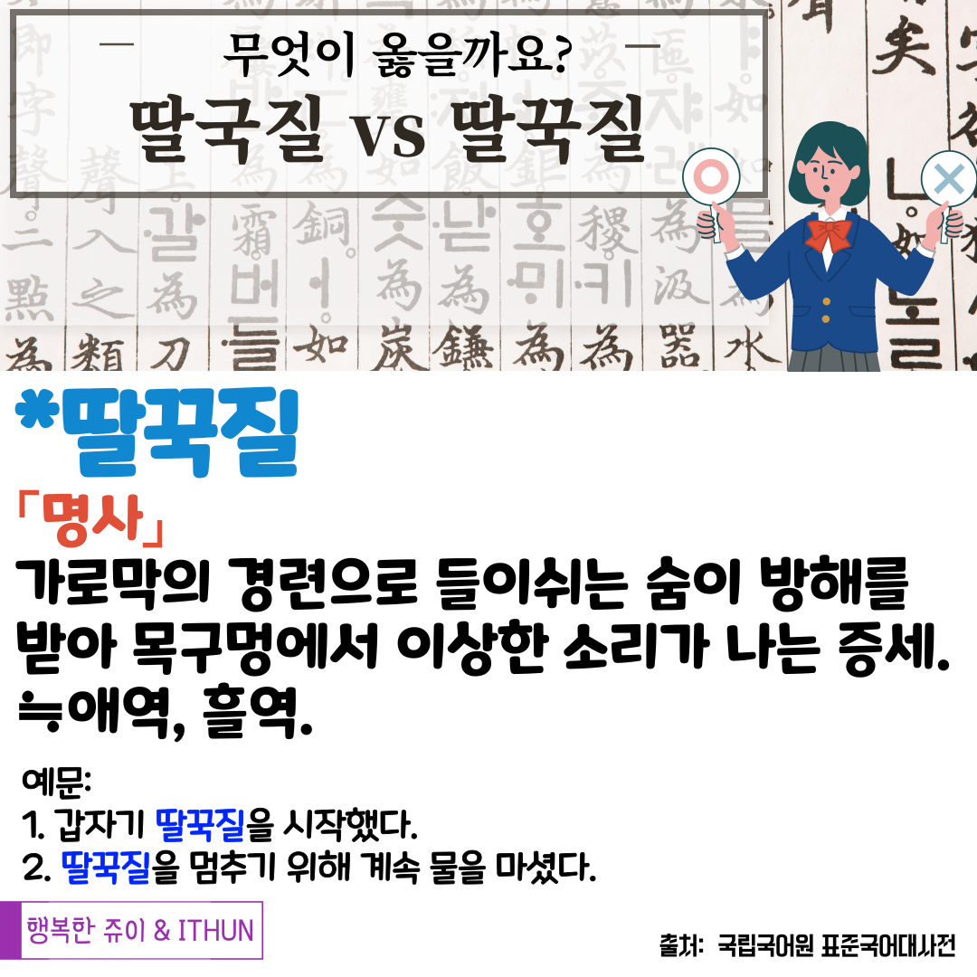 '딸꾹질' 이 [딸꾹질] 로 발음 되기 때문에 왠지 원형이 '딸국질' 인 것은 아닐까? 라는 의심이 살짝 들었는데 이전에 익숙하게 썼던 것처럼 '딸꾹질' 이 옳은 표현이었다. 그리고 보통 '딸꾹질하다' 라고 '딸꾹질' + '하다' 붙여 쓴다.