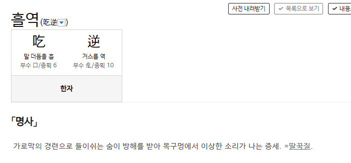 '딸꾹질' 은 순우리말이고 '애역', '흘역' 은 한자어였다. 그런데 지금은 이런 단어를 쓴 사람을 적어도 내 주변에서는 본 적이 없다. 나중에 책을 통해서 읽게 된다면 '딸꾹질' 을 의미하는 것이구나!라는 걸 쉽게 알아차릴 것 같다.
