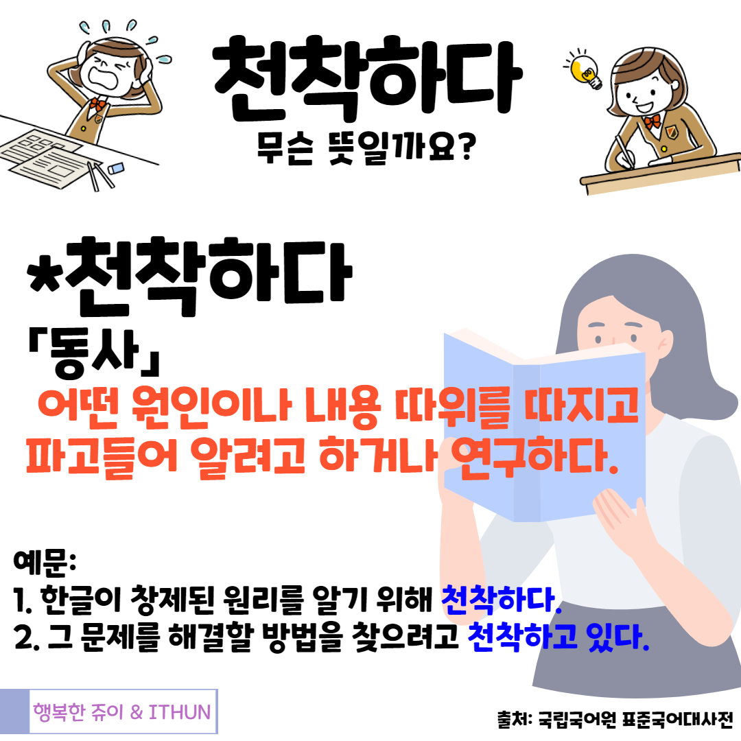 나혼자 산다 (447회2022.05.27 (금)) '파비앙' 님이 나오는 에피소드를 보다가 '천착하다' 라는 단어를 알게 되었다. 부끄럽지만... 외국인이 알고 있는 단어를 내가 모르다니. 정말 처음 들어본 단어였다. 그래서 그런지 PD님도 '천착하다' 를 '정착하다' 로 자막을 잘못 사용하는 에피소드도 있었다. '파비앙' 님의 한국을 사랑하는 마음이 가득 느껴졌던 에피소드 소원하던 영주권 취득에서부터, 한국어 자격증 1급 합격에, 문화재 해설사 일까지 하고 있다니 정말 대단대단, 엄지척! 한국인으로서 정말 '파비앙' 님이 가지고 있는 한국사 지식 및 한국에 대한 관심에 자동 반성이 되는 시간이었다. 어쨌든 오늘은 '천착하다' 는 단어가 무슨 뜻인지 정리해 보려고 한다.