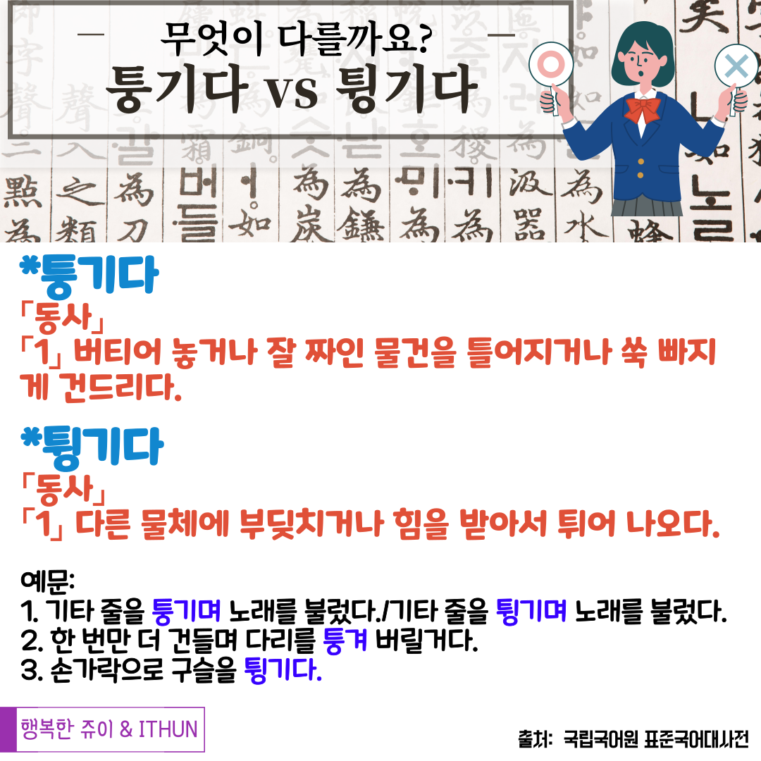 오늘은 '퉁기다', '튕기다' 에 대해 자세히 알아보았다. 같이 사용할 수 있을 때도 있고 그렇지 않을 때도 있으니 잘 구별해서 써야겠다.