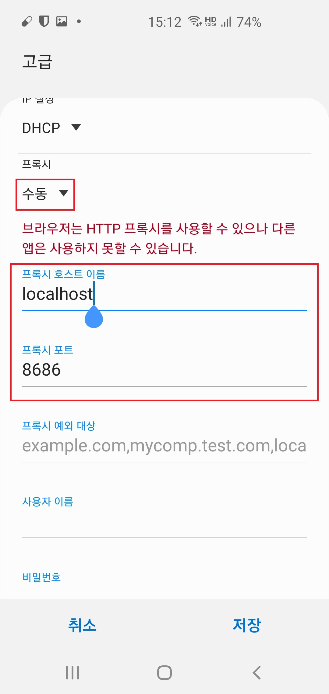 6. 마지막입니다. 프록시를 수동으로 바꾸고 프록시 호스트 이름에 localhost 또는 DDNS를 입력하고 포트는 그린터널 설치시 설정한 포트를 입력하면 됩니다.