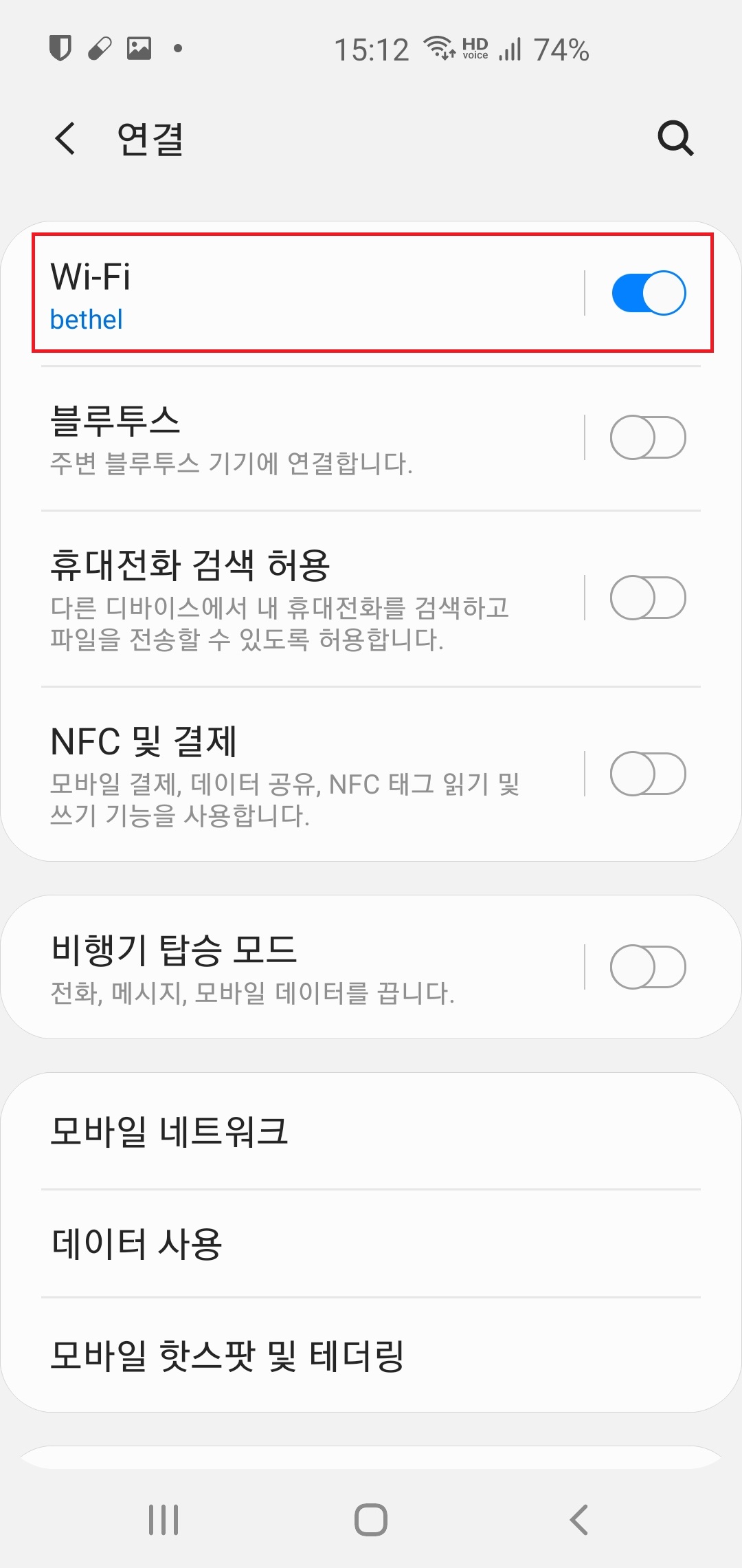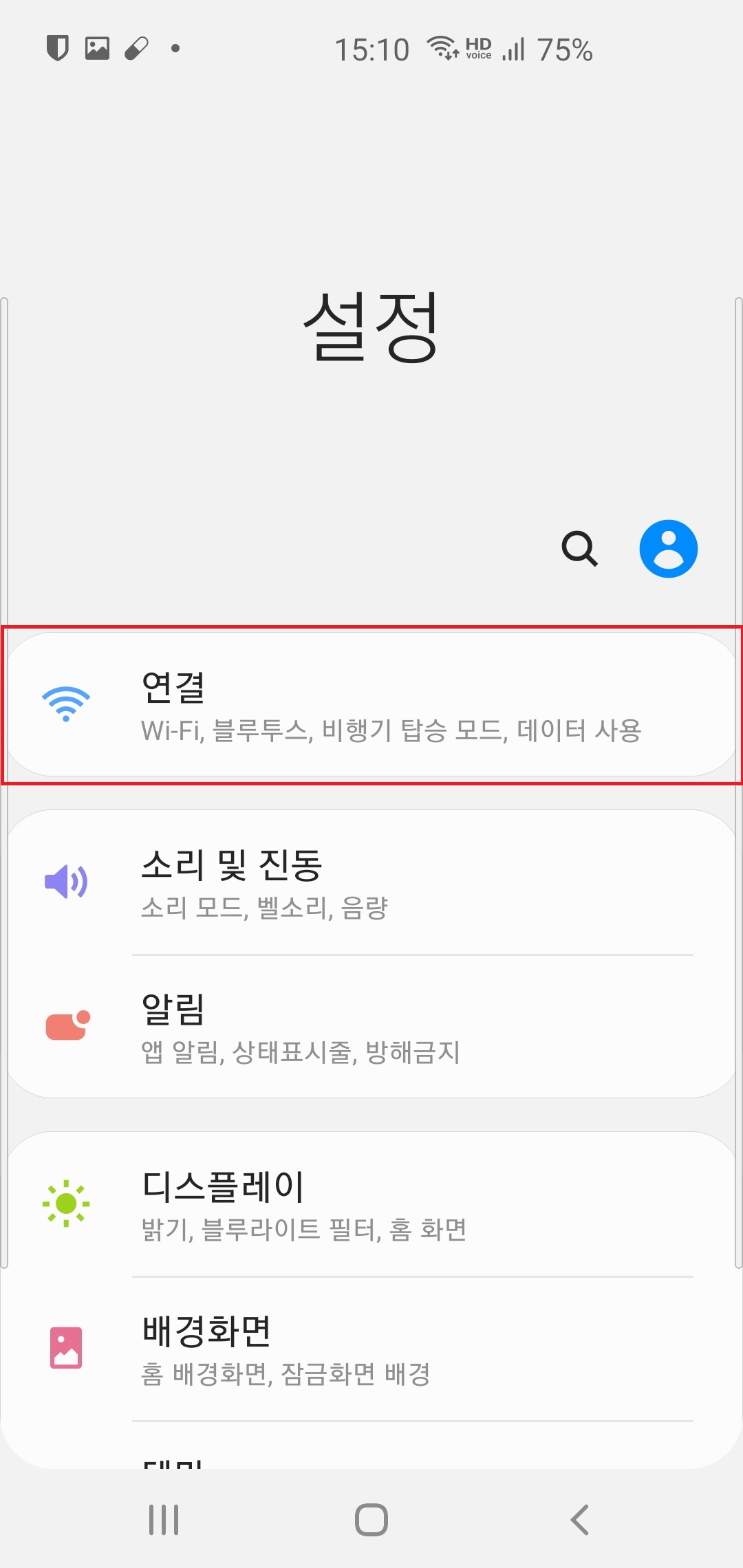 2. 설정창을 클릭하면 다양한 설정메뉴가 나옵니다. 연결 메뉴를 클릭!