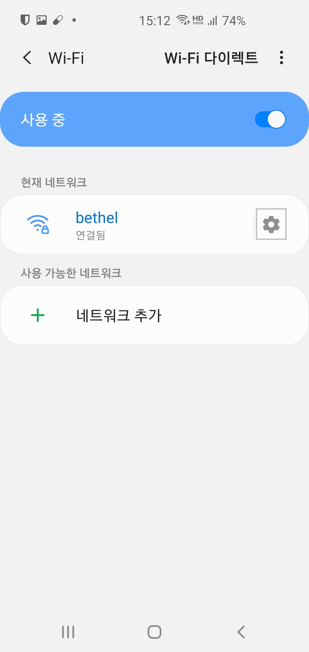4. 와이파이 설정창에 들어가면 지금 연결하고 있는 와이파이가 보입니다. 연결된 와이파이 옆에 톱니바퀴를 클릭!