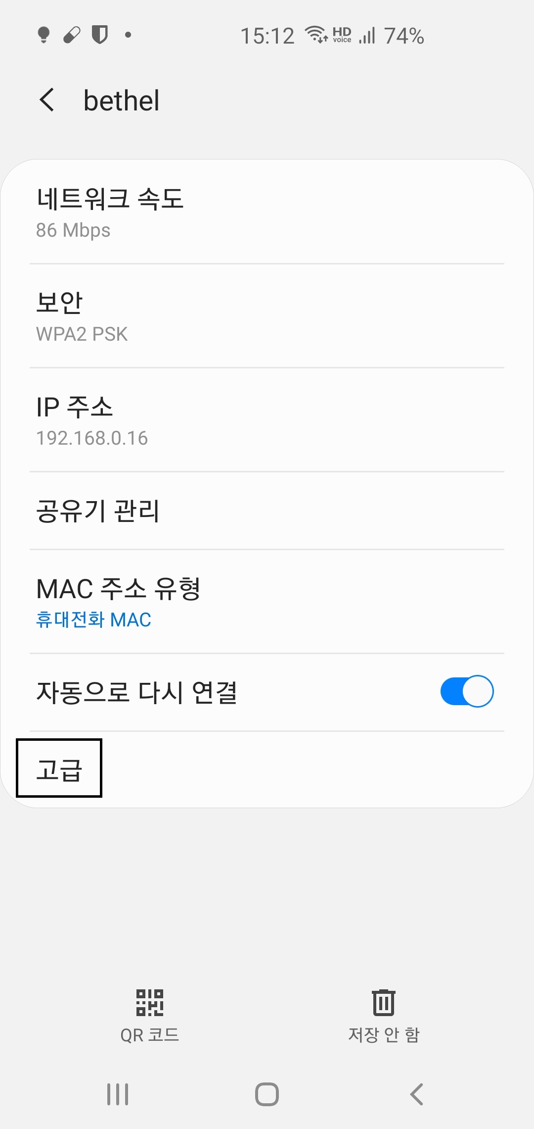 5. 톱니바퀴를 클릭하면 와이파이 연결정보가 나옵니다. 맨 아래 보면 고급 클릭!