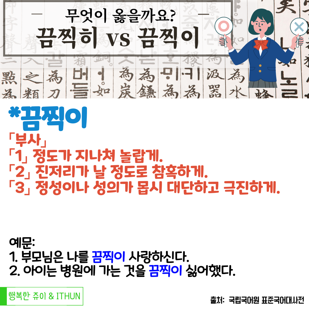 끔찍이vs끔찍이 이, 히 로 끝나는 단어 구별이 쉽지 않다.