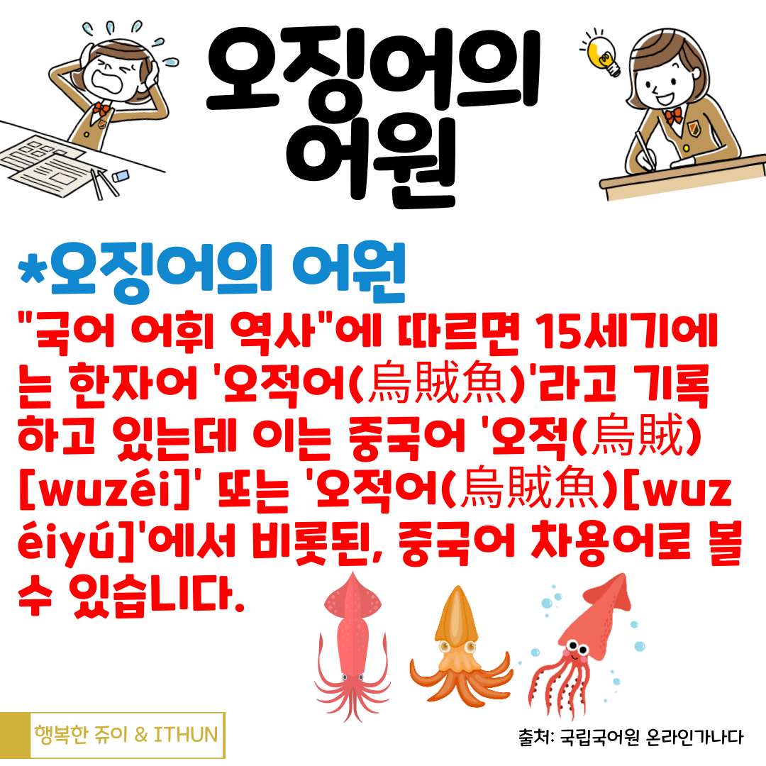 오징어하면 다리가 10개. 문어는 다리가 8개 항상 헷갈렸던 일. 오징어와 문어 다리 개수 구별하기! 열심히 구분했던 기억이 선명하다. 오징어! 자주 들었던 단어 당연히 우리말이라고 생각했는데, 얼마전 놀라운 사실을 알게 되었다. 그래서 정리해 보려고 한다.