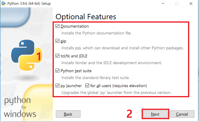 3-2. Optional Features은 체크 그대로 놔두고 NEXT를 누른다.