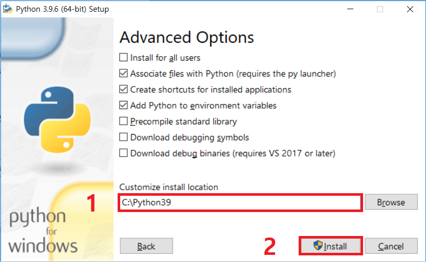 3-3. 설치 경로는 꼭 c:\python39로 하고 Install 클릭한다.