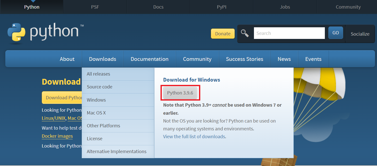 2. 설치 환경에 맞게 파이썬 다운로드(아래의 사진은 윈도우 환경)