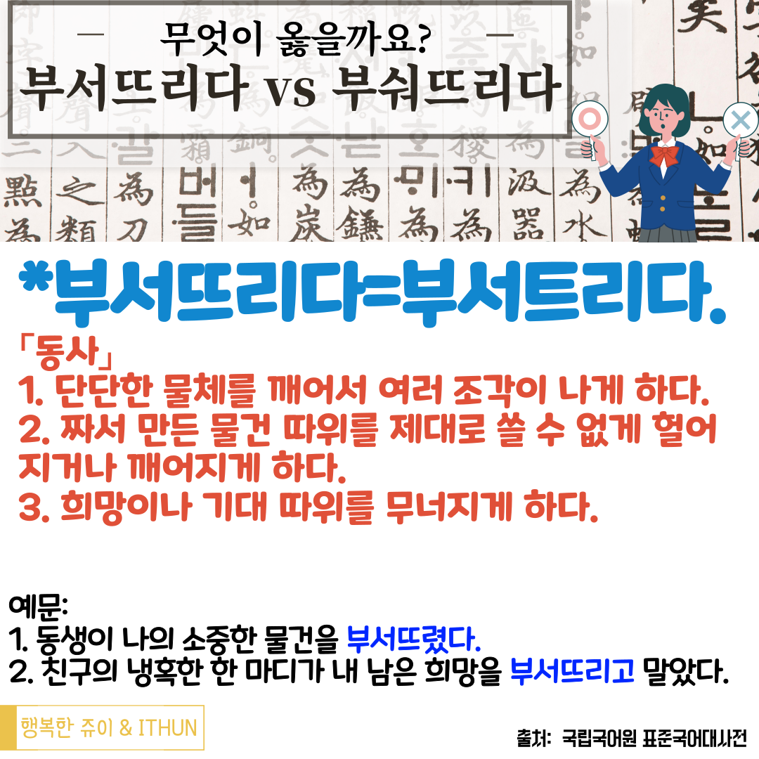 문제 1번 도자기를 부서뜨리다. (O) vs 2번 도자기를 부숴뜨리다. (X)