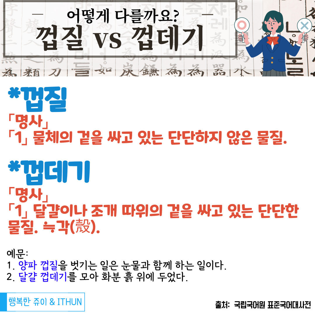 그런데 여기서 놀랬던 것은 '껍데기' 와 비슷한 단어로 한자어 '각' 소개되었는데, 한자 '각' 은 껍질 '각' 이었다. 그래서 예전에는 '껍질', '껍데기' 를 구분하지 않고 편하게 사용했던 건가? 궁금해졌다. 뜻도 대부분 비슷하여 꼭 형제 단어처럼 생긴 '껍질' 과 '껍데기' 과거에는 어떻게 사용했을지 궁금해졌다.