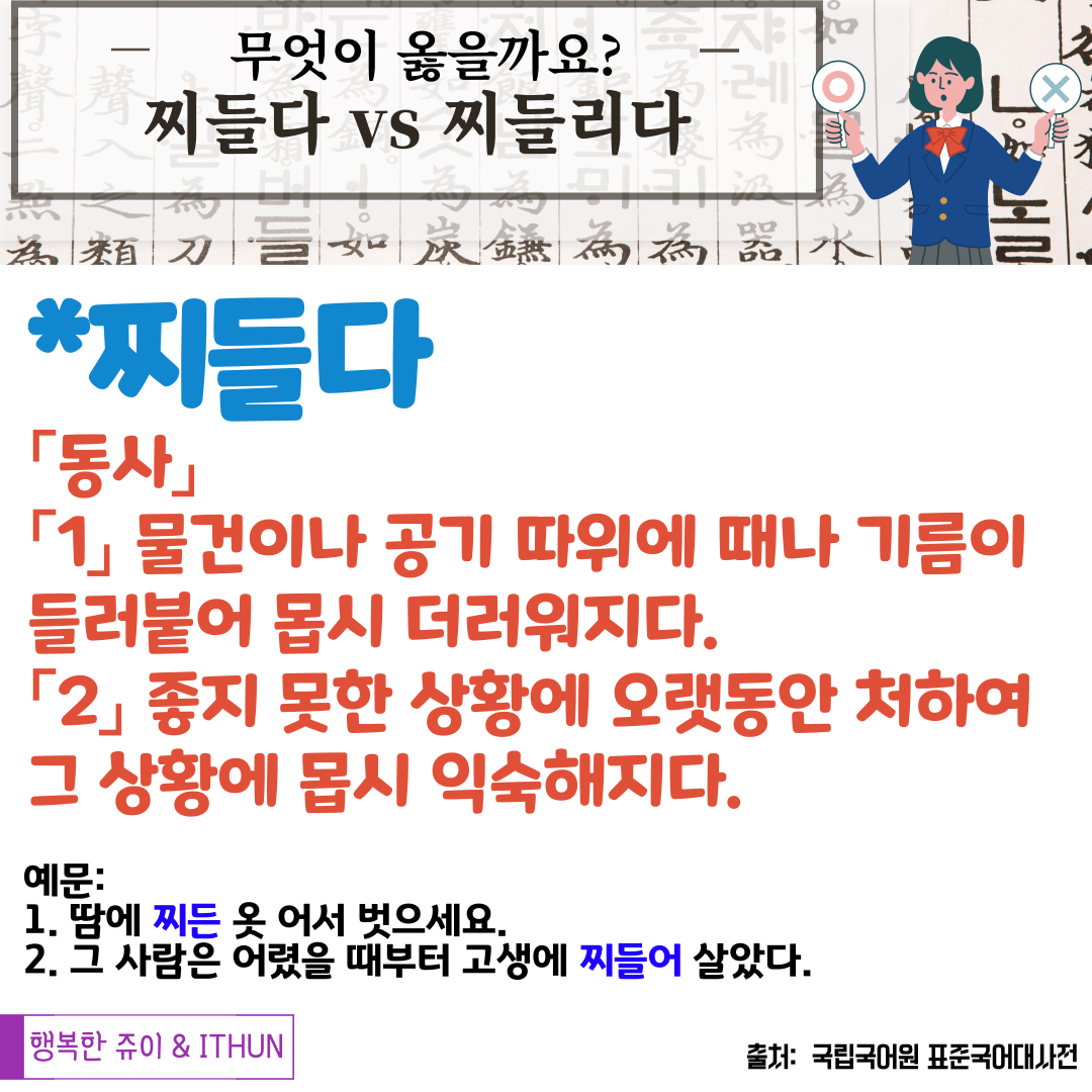 '물건이나 공기 따위에 때나 기름이 드러붙어 몹시 더러워지다.' '좋지 못한 상황에 오랫동안 처하여 그 상황에 몹시 익숙해지다.' 를 나타내는 단어는 '찌들다' 이다. 그러나 많은 사람들이 '찌들리다' 로 잘못 사용하고 있다. 국립국어원 표준국어대사전에서 '찌들리다' 를 검색하면 옳은 표현인 '찌들다' 를 찾아 검색하라는 뜻으로 '→찌들다' 이렇게 나와 있다.