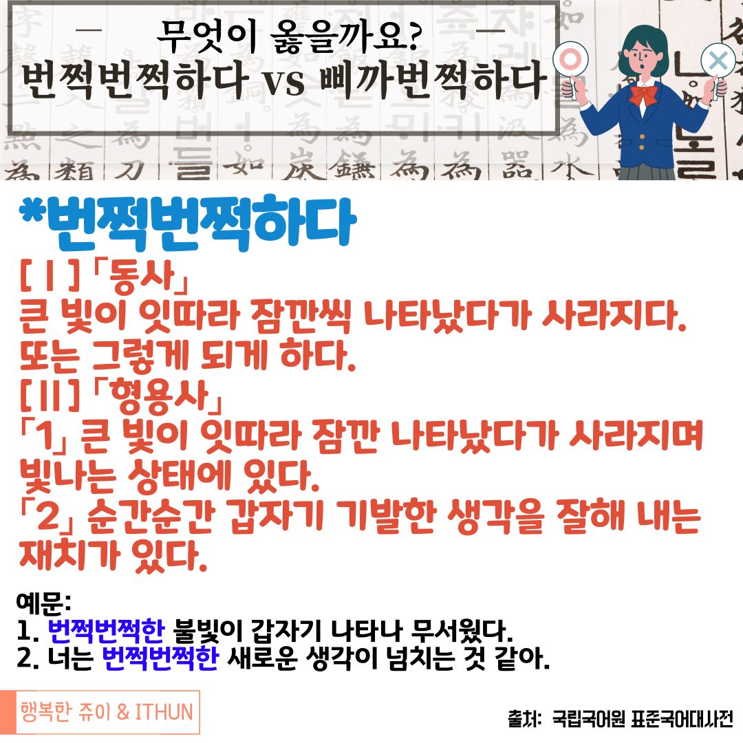 내용을 정리하다가 '삐가번쩍하다' 는 '삐까' + '번쩍' 으로 구성된 단어 임을 알게 되었다. 여기서 '삐까' 는 일본어에서 온 말로 일본어의 의태어에서 온 것이다. '비까번쩍' 은 '비까' 와 국어의 의태어 '번쩍' 이 결합한 말로 '번쩍번쩍하다' 로 순화해서 사용해야 한다.